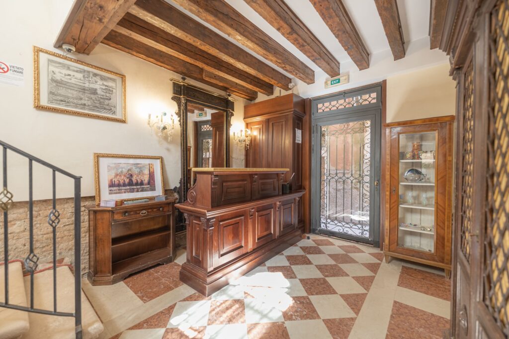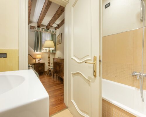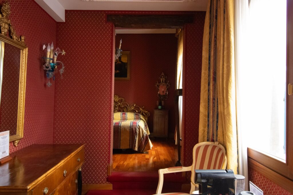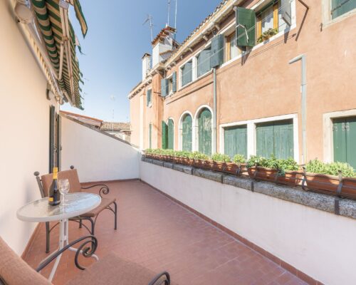 La camera di lusso che occupa l’ultimo piano della locanda ha una stupenda terrazza da cui si gode di un’invidiabile vista sui tetti di Venezia.