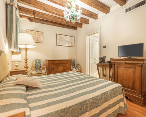 Le stanze, arredate con eleganza discreta e recentemente restaurate, spaziose e luminose, sono distribuite sui tre piani del palazzo. Con mobili in stile e tappezzerie raffinate, rese particolarmente accoglienti dalle travi a vista, dai parquet lucidi, dalle tappezzerie antiche, le stanze coniugano perfettamente design chic e contemporaneo con la tradizione e la classicità.